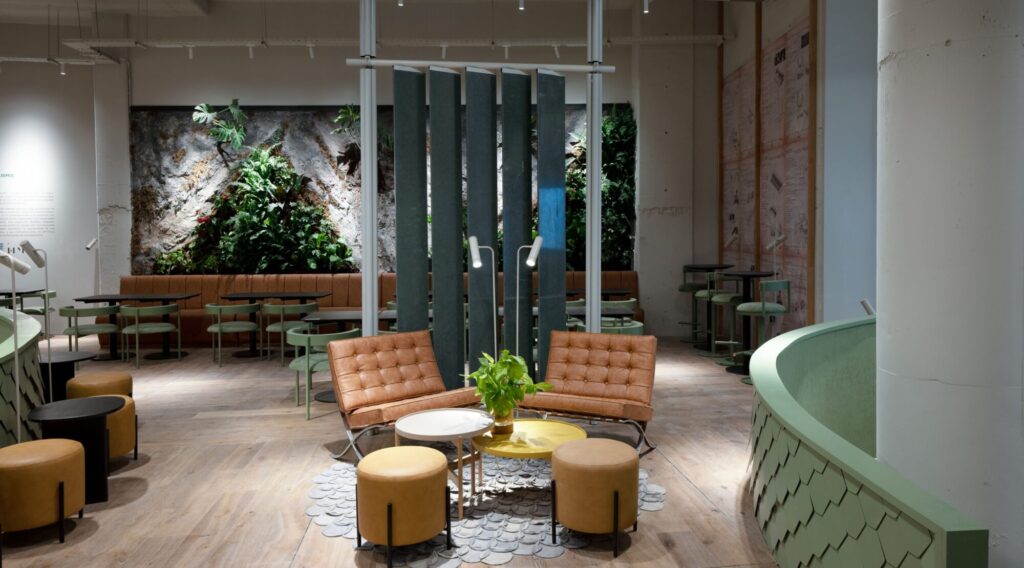 La cafetería de esta edición se inspira en el estilo del restaurante-bar Osten, con un diseño ligado a los años 20 y 30. Funciona como espacio de descanso, punto de encuentro y, al mismo tiempo, como intervención arquitectónica dentro de la muestra.
