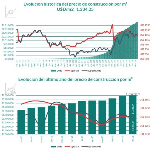 Medido en moneda dura, el costo de construcción se ubicó en USD 1.334,25 por m2, lo que representó una baja del 3,09% respecto de noviembre, cuando había alcanzado los USD 1.376,80. De este modo, el año cerró con valores en dólares algo más bajos que los máximos recientes, aunque todavía lejos de los mínimos históricos que el sector recuerda como referencia de viabilidad para proyectos masivos.