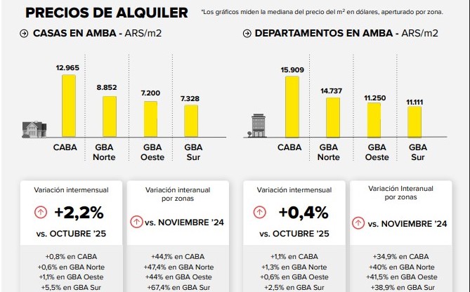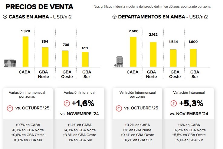El relevamiento de precios de propiedad de noviembre 2025, un trabajo conjunto de Mercado Libre y la Universidad de San Andrés (UDESA), muestra un incremento interanual en los precios de venta. El precio mediano de venta de departamentos en dólares por metro cuadrado sube 5,3% respecto a noviembre de 2024, con alzas lideradas por GBA Norte (6.2%) y CABA (6.0%). A nivel intermensual, los precios de departamentos suben 0.2% en CABA y 0.7% en GBA Sur.