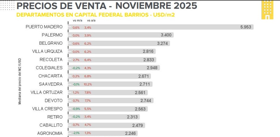 El siguiente listado muestra los cinco barrios de la Ciudad Autónoma de Buenos Aires (CABA) que registraron el mayor incremento interanual en el precio de venta de departamentos a noviembre de 2025, según el relevamiento de Mercado Libre y UDESA: