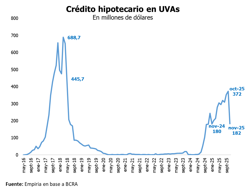 Esa dinámica se vio con claridad en la semana previa a las elecciones, cuando la demanda se concentró de manera casi inédita. En ese lapso se registraron solicitudes por USD 148 millones en créditos UVA, una cifra que mostró una avalancha de carpetas a punto de cerrarse. Tras el proceso electoral, el volumen cayó a USD 56 millones y noviembre profundizó ese declive.