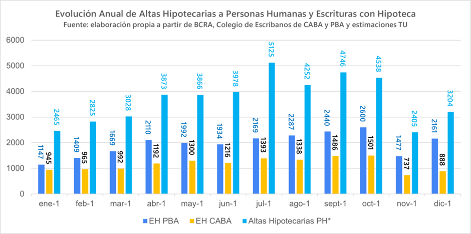 La evolución mensual del crédito mostró un comportamiento irregular hacia el cierre del año. Octubre concentró el mayor nivel de actividad, con más de 2.600 escrituras hipotecarias en la provincia y cerca de 1.500 en CABA, impulsadas por decisiones anticipadas ante el calendario electoral. En noviembre se observó una desaceleración, mientras que diciembre cerró con un repunte que devolvió la actividad a niveles similares a los del invierno.