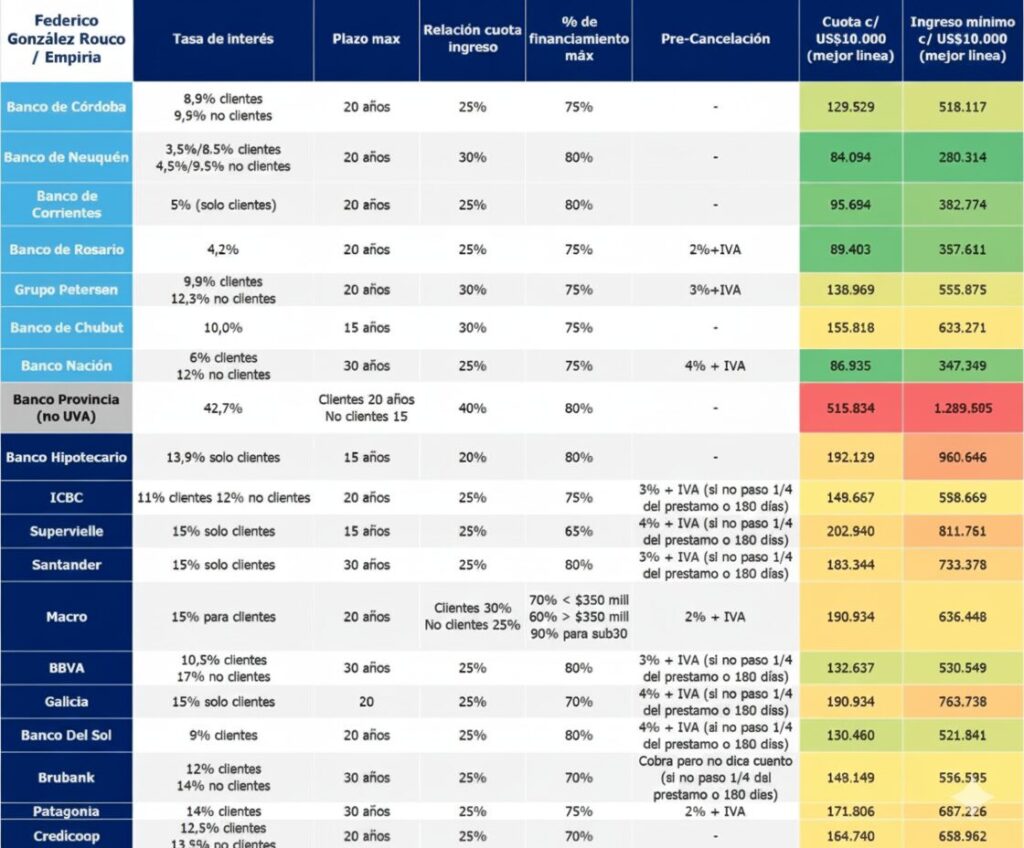El economista explicó que cada banco fija una relación cuota–ingreso que va del 20% al 40% y que la tasa y el plazo determinan el valor de cada cuota. A partir de esa información, calculó el ingreso mínimo por cada USD 10.000 prestados. La transformación a un crédito de USD 100.000 solo exige multiplicar por diez.