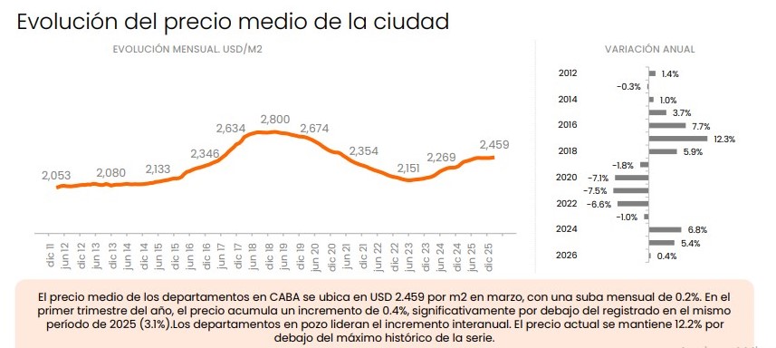 Según el último informe de Zonaprop, el precio medio del metro cuadrado acumula una suba del 0,4% en el primer trimestre de 2026, por debajo del incremento registrado en el mismo período de 2025. En marzo, el valor alcanza los USD 2.459 por m2, con un incremento mensual del 0,2%, lo que confirma una tendencia de crecimiento leve, sin capacidad de traccionar una suba sostenida.