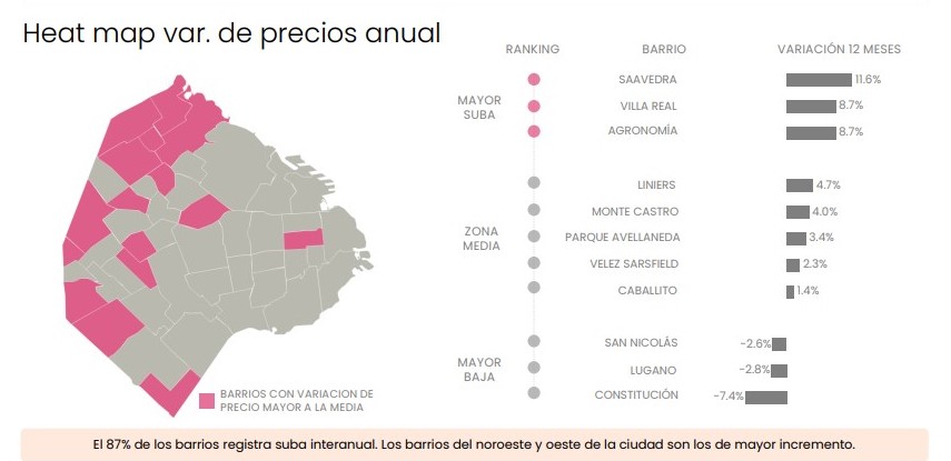 Al mismo tiempo, la dinámica de precios muestra comportamientos diferenciados según la zona. Barrios con valores de ingreso más accesibles captan parte de la demanda desplazada y registran subas moderadas, en torno al 1% al 2% mensual. En cambio, zonas con menor demanda o mayor sobreoferta presentan debilidad en los valores y requieren ajustes más agresivos para concretar operaciones.