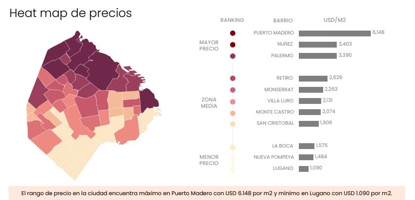 La segmentación geográfica también refleja diferencias marcadas. Puerto Madero se mantiene como el barrio más caro de la Ciudad, con USD 6.148 por m2, seguido por Núñez con USD 3.403 y Palermo con USD 3.390. En contraste, Villa Lugano registra el valor más bajo con USD 1.090 por m2, mientras que Nueva Pompeya y La Boca se ubican en USD 1.484 y USD 1.575 respectivamente.