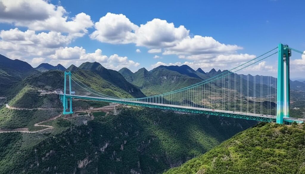 atraviesa una de las zonas más montañosas del territorio chino —donde más del 90% del suelo presenta barrancos y desfiladeros profundos— y alcanza una longitud total de 2.890 metros, con un tramo principal de 1.420 metros, el mayor en un entorno de montaña. La obra superó recientemente una prueba de carga clave, paso previo a su habilitación definitiva al tránsito.