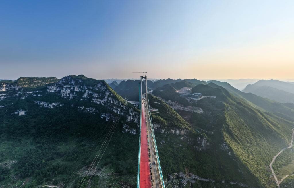 Vista panorámica del puente en funcionamiento, integrándose al paisaje montañoso de Guizhou y reduciendo el tiempo de cruce del cañón de dos horas a apenas dos minutos