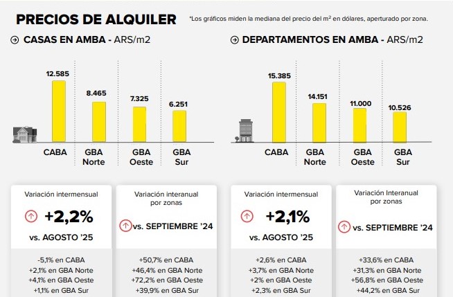 En paralelo, el mercado de alquileres mantiene una dinámica propia. En pesos corrientes, los valores subieron 2,2% en casas y 2,1% en departamentos en la comparación mensual. Frente a septiembre de 2024, las variaciones fueron más fuertes: 44,2% en casas y 31,9% en departamentos.