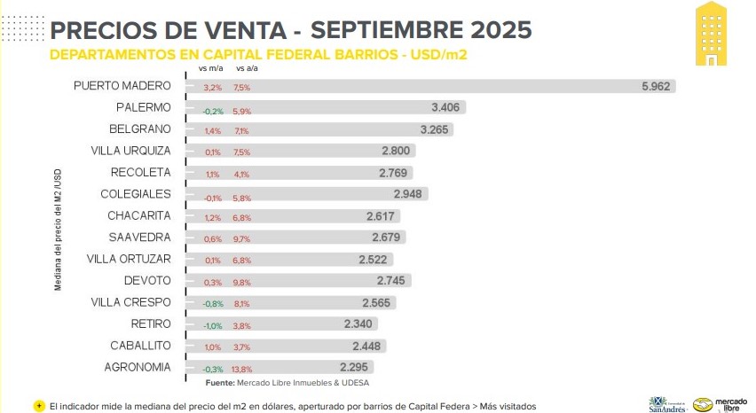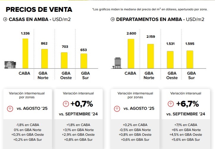 De acuerdo con el relevamiento de Mercado Libre y la Universidad de San Andrés (UDESA), los valores de venta se movieron en direcciones distintas según el tipo de propiedad. En el último año, las casas registraron un aumento interanual del 0,7% en el AMBA, mientras que los departamentos avanzaron 6,7% respecto a septiembre de 2024.