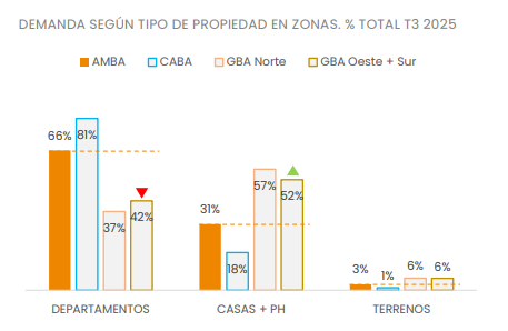 Este furor por el PH contrasta fuertemente con la menor demanda por casas, que en CABA reciben un 5% menos de consultas que los departamentos. En el Gran Buenos Aires la preferencia por las casas es alta, pero las Propiedades Horizontales siguen marcando el pulso por su equilibrio entre independencia y precio.