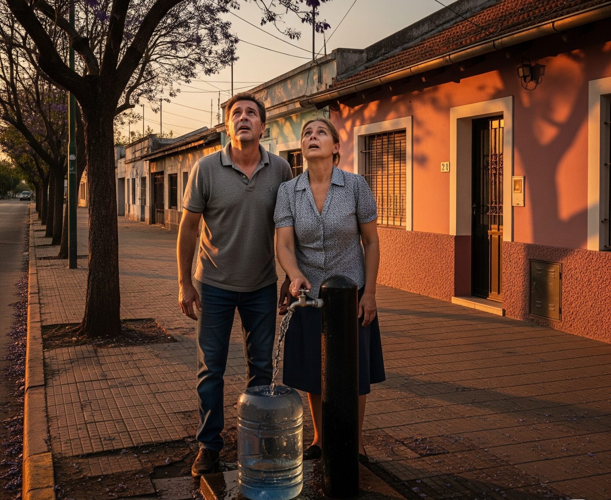 Una pareja implora una solución a los problemas de habitabilidad, mientras obtienen agua de una canilla pública, reflejando el 51% de los hogares urbanos en Argentina que carecen de servicios básicos