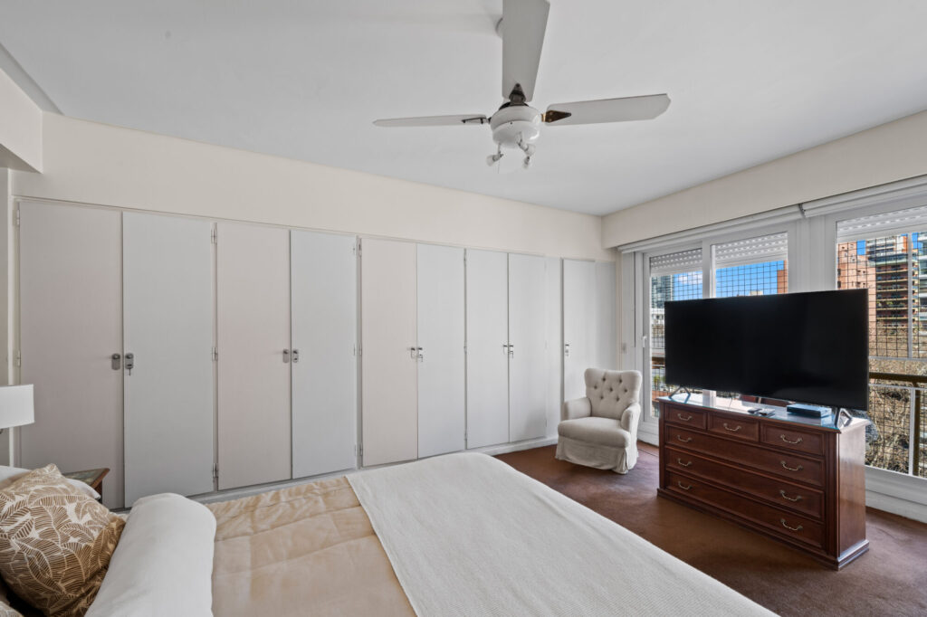 Sobre el inmueble, Tambussi destacó la fachada sobria de color beige, los ventanales verticales y el hall de acceso con sectores vidriados semicirculares. “Se trata de una tipología escasa: departamentos de gran superficie, doble circulación, escalera interna y un segundo piso destinado a ocio y privacidad”, agregó. También resaltó la amplitud de los ambientes y las renovaciones recientes, como las aberturas de aluminio con doble vidrio hermético, que mejoran el aislamiento.