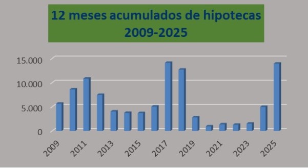 En contraste, las escrituras con hipoteca mostraron una baja interanual mensual del 21,4%, confirmando la desaceleración del crédito hacia el cierre de 2025.