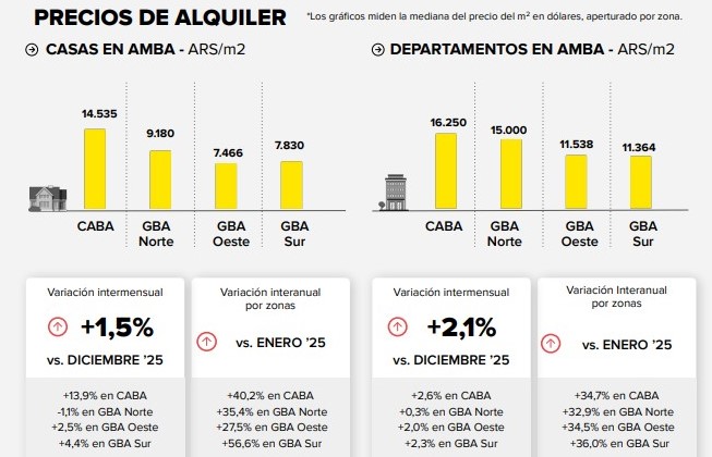 La comparación interanual mostró incrementos aún más marcados. Entre enero de 2025 y enero de 2026, los alquileres de departamentos aumentaron 34,7% en CABA, 32,9% en GBA Norte, 36,0% en GBA Sur y 34,5% en GBA Oeste. En el caso de las casas, las subas interanuales alcanzaron el 35,4% en GBA Norte, el 56,6% en GBA Sur y el 27,6% en GBA Oeste.