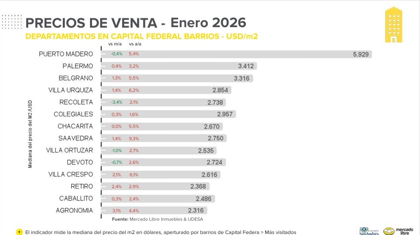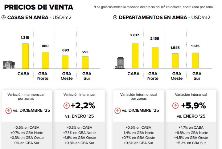 La comparación interanual mostró un escenario más claramente positivo. Entre enero de 2025 y enero de 2026, el precio mediano de venta en dólares por metro cuadrado de los departamentos aumentó 5,9% en el conjunto del AMBA, mientras que el de las casas subió 2,2%.