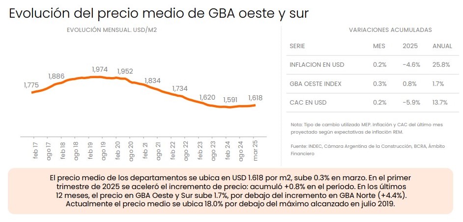 En GBA oeste-sur, el precio medio del metro cuadrado alcanzó los USD 1.618 en marzo, con una suba de 0,3% mensual y de 0,8% en el primer trimestre. El aumento interanual es de 1,7%, lejos del 4,4% registrado en zona norte. Aun así, el valor sigue 18% por debajo del máximo histórico de julio de 2019 in formaron desde Zonaprop.
