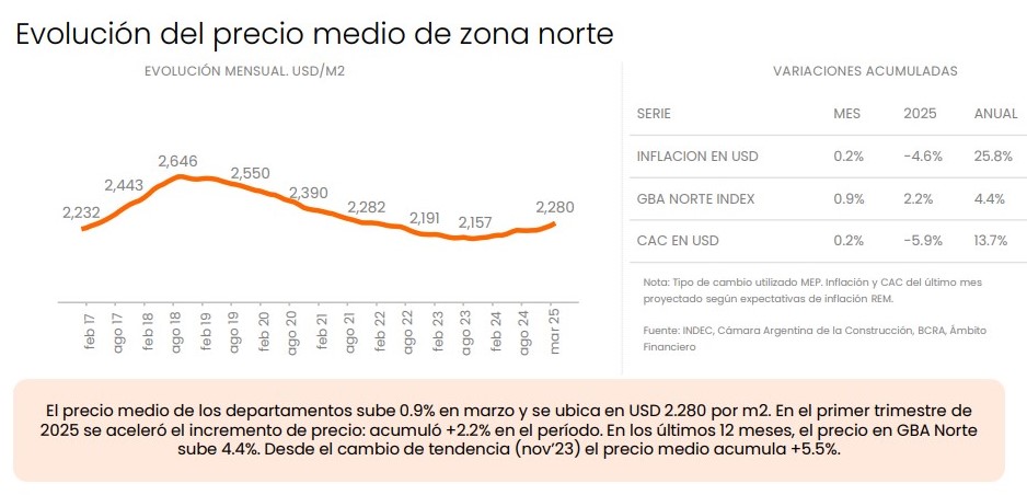 Según datos de Zonaprop, el precio medio del metro cuadrado en GBA norte se ubicó en USD 2.280 en marzo, lo que representa una suba del 0,9% en el mes y del 2,2% en el primer trimestre. En comparación interanual, el valor se elevó 4,4% respecto de marzo de 2024. El cambio de tendencia se consolidó desde noviembre del año pasado, cuando los valores comenzaron a mostrar aumentos luego de varios meses de caídas informaron desde el portal.