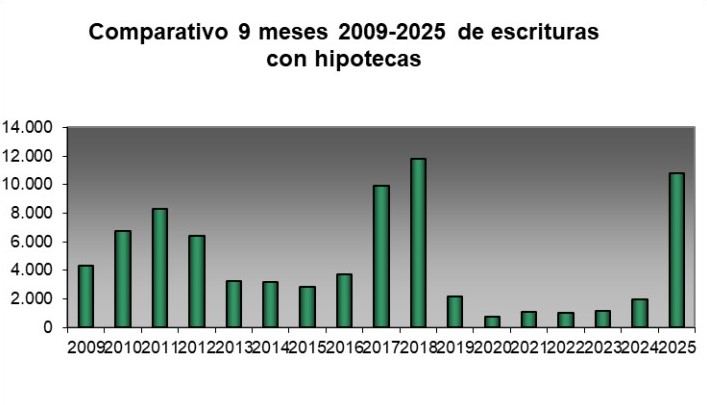 En los primeros nueve meses del año se acumularon casi 50.000 operaciones, de las cuales más de 10.000 se realizaron con crédito hipotecario. Esto implica que poco más del 20% de las compraventas se financian con hipoteca, un nivel que sigue lejos de los picos de años anteriores.