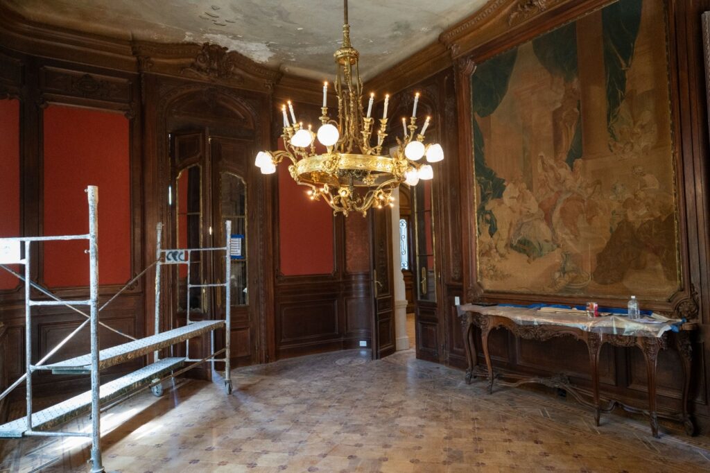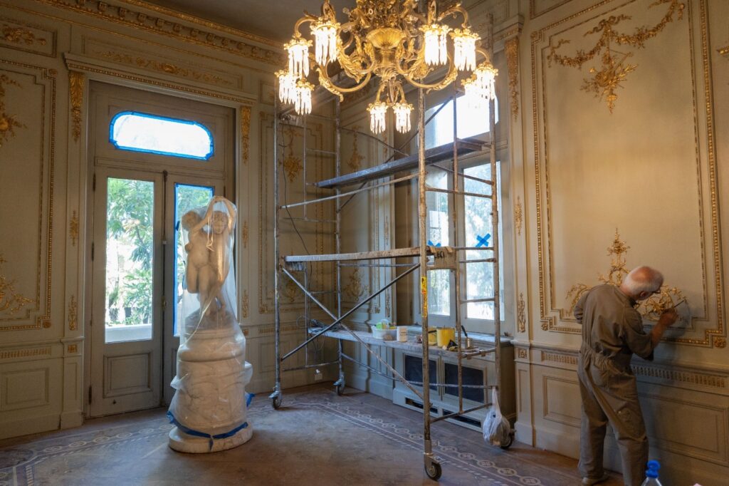 Salón en proceso de restauración con trabajos de dorado a la hoja y recuperación de detalles decorativos; la intervención respeta la estética original del edificio
