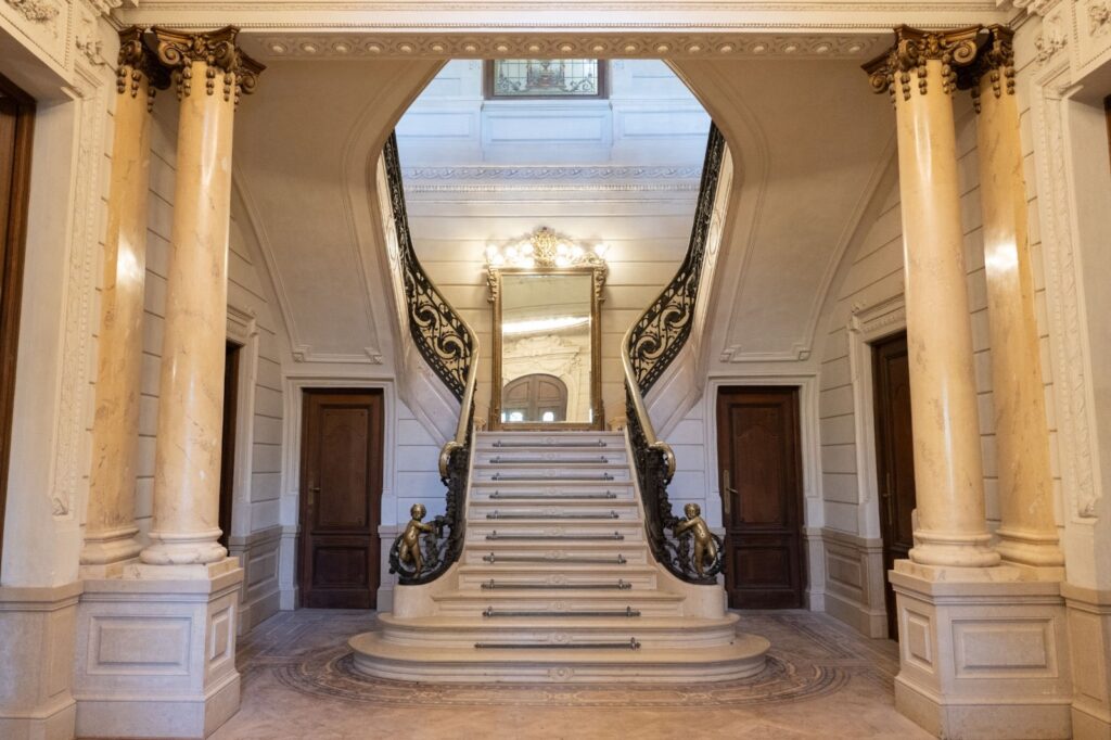 Hall central con escalera imperial de mármol, barandas de hierro forjado y columnas revestidas, uno de los espacios más representativos de la residencia