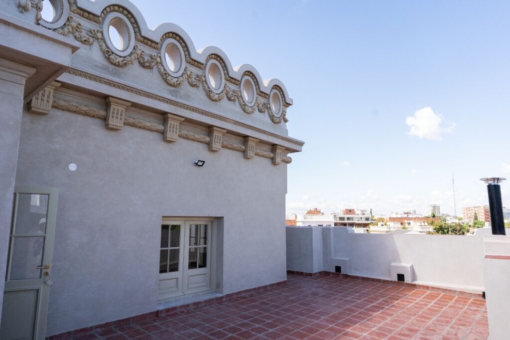 Terraza restaurada con detalles ornamentales en la cornisa y vistas abiertas al entorno urbano de Villa Devoto